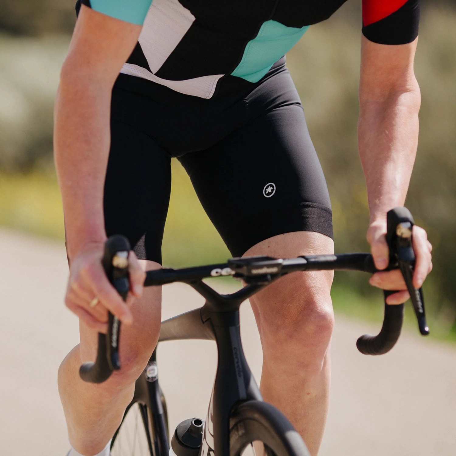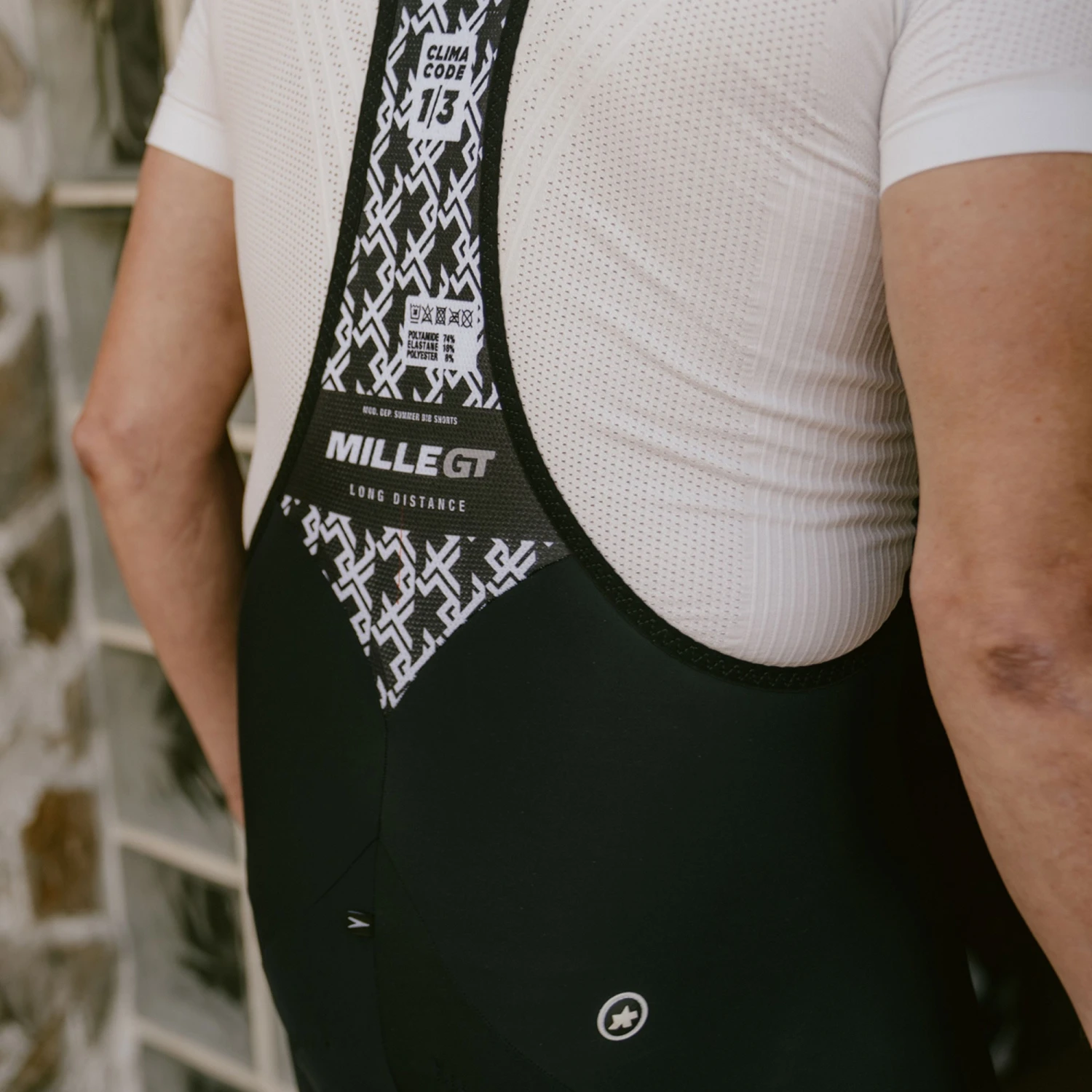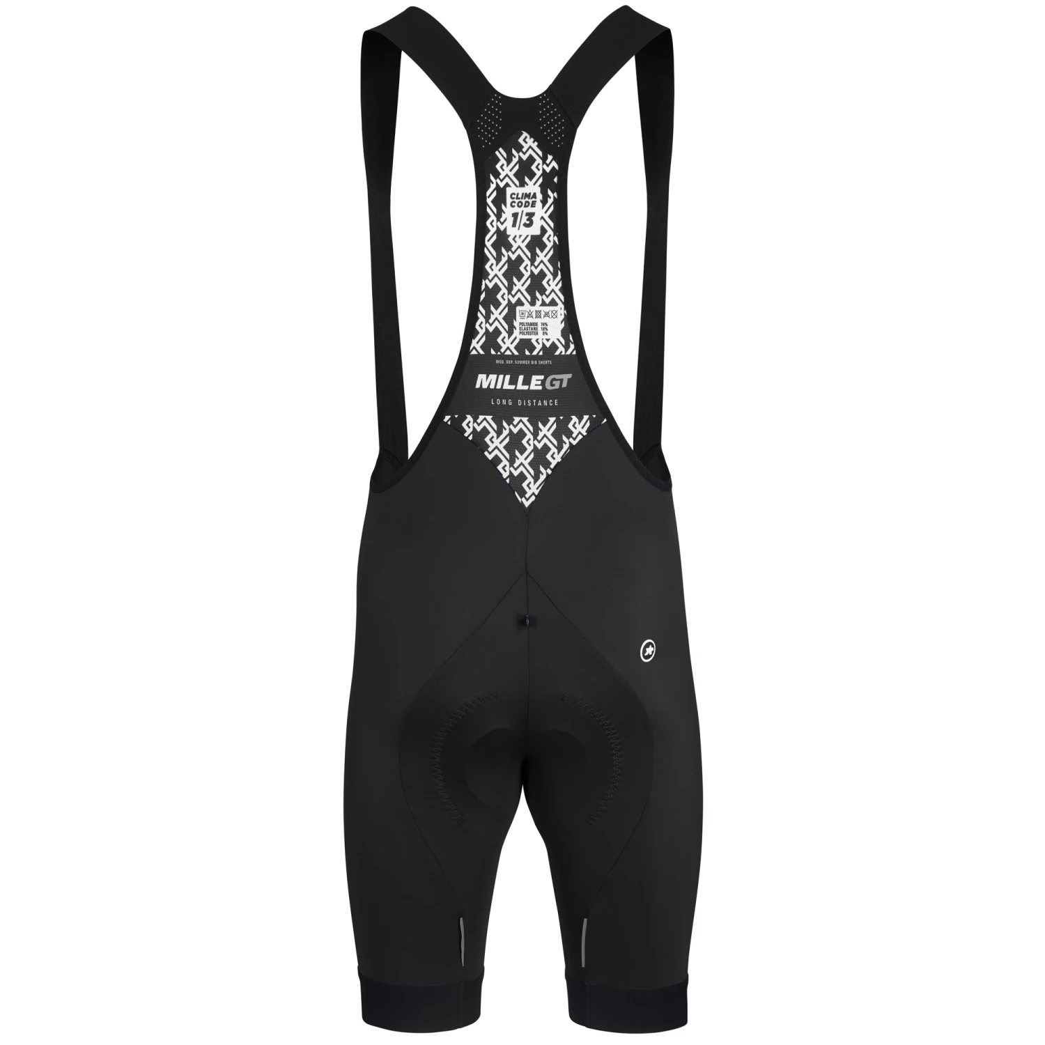 A MILLE EVO SUMMER insert has 8mm of protective memory foam, perforations in the front, a 3D waffle construction for breathability and goldenGate technology so it will move with your body. The upper uses Assos’ Y7 Frame Carrier design and Stabilizator V3 mesh to the back for stability and the straps at the front are wide and flexible. The short is held in place at the leg by minimal superFlat grippers.